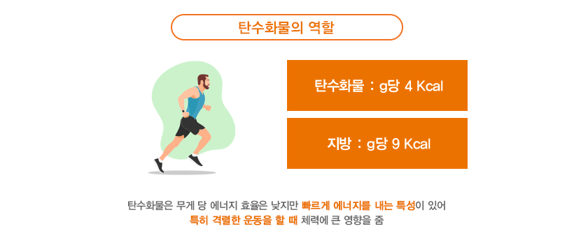 탄수화물과 지방을 에너지원으로서 비교하면, 탄수화물은 g당 4Kcal, 지방은 g당 9Kcal를 냅니다.