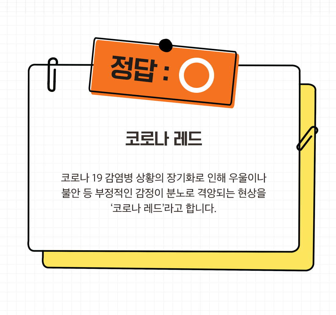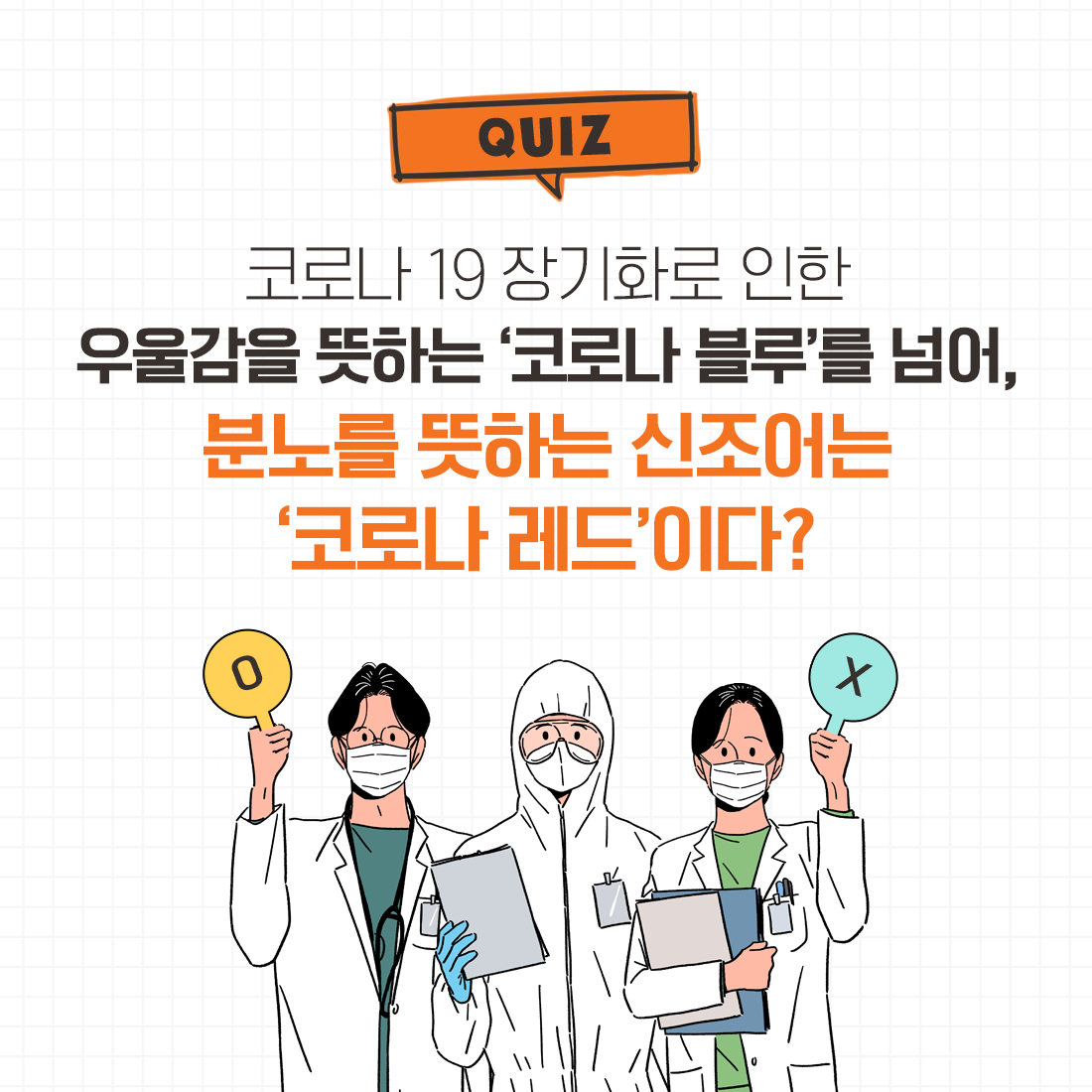 그렇다면 코로나 19 장기화에 따른 우울감이 심화되면서, 코로나 블루를 넘어서 분노와 폭발의 감정을 표현하는 단어는 ‘코로나 레드’이다? 댓글을 통해 O/X를 정답으로 남겨주세요.