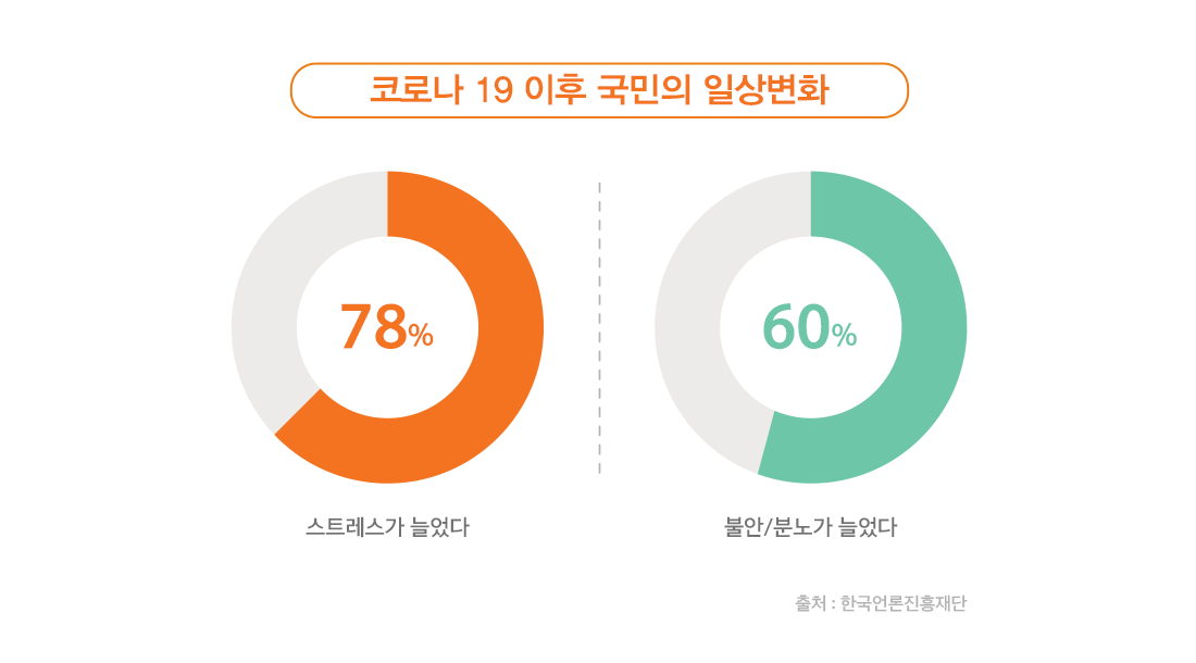 실제 한국언론진흥재단에서 한국인 성인 남녀 1,000명을 대상으로 ‘코로나 19 이후 국민의 일상 변화’를 조사한 결과, 응답자의 78%가 코로나 19 발생 이전의 삶과 비교했을 때 일상 속 스트레스가 늘었다고 응답했으며, 불안과 분노 심리가 커졌다는 응답도 60%가 넘는 수치를 기록했습니다.