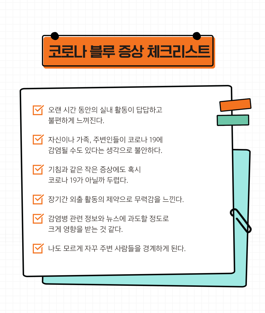 만약 위 체크리스트 절반 이상이 해당되는 경우에는 코로나 블루 극복을 위한 적극적인 노력이 필요합니다.