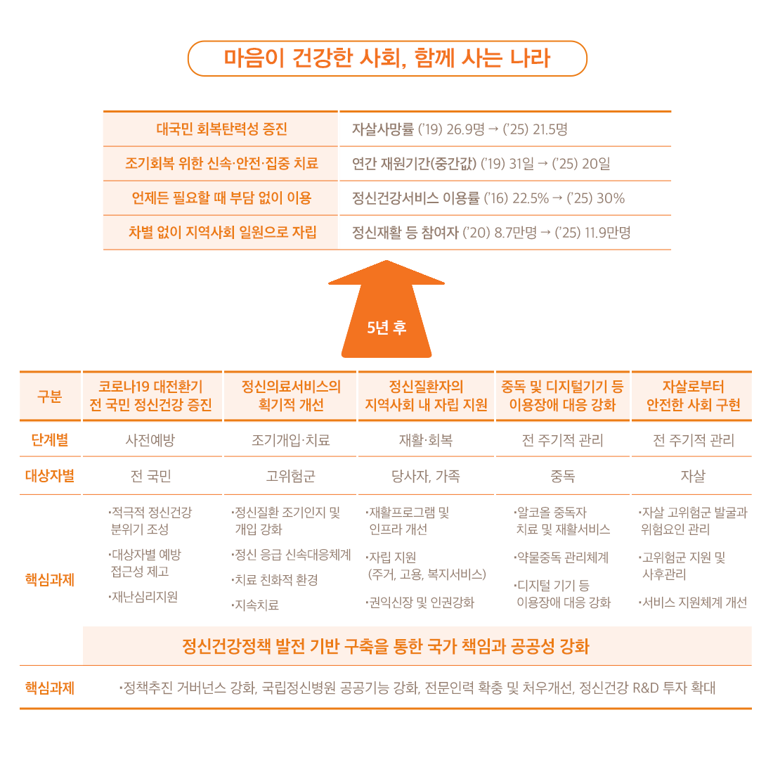 2019년 인구 10만 명 당 26.9명으로 집계되었던 자살 사망자 수를 2025년엔 21.5명 수준으로 낮추겠다는 목표도 함께 밝혔습니다.