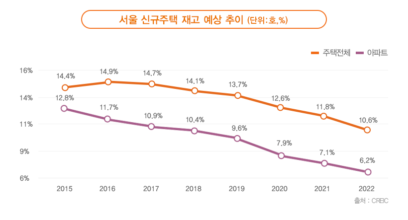 이러한 까닭으로 건설산업연구원은 특히 신규아파트 가격 상승을 주장하고 있습니다. 신규주택 공급이 지속적으로 감소하면서 서울 내 경과 연수 5년 내 신축주택 및 신규아파트 감소해 각각 2020년 12.6%, 7.9%이지만 2022년에는 10.6%와 6.2%로 감소할 것으로 예상하고 있습니다. 2022년 신축 아파트 비율 6.2% 수준은 전체 주택 중 3.5%에 불과하여 신규아파트 공급 부족은 2020년보다 더 클 것으로 보고 있습니다.