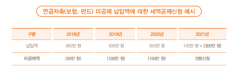 무슨 뚱딴지 같은 소리냐고 반문하는 사람이 있을 수 있겠는데, 연금저축(계좌) 연간 세액공제 한도는 400만 원입니다. 여기에 IRP 300만 원까지 합하면 연금계좌는 연간 700만 원까지 가능하고, 연간 1,800만 원까지 불입이 가능합니다. 그렇다면 연금저축(계좌)의 경우 400만 원을 초과해서 납부하면 세액공제를 받지 못할까요? 정답은 아닙니다. 세액공제 한도를 초과해서 해당 연도에 세액공제를 받지 못했지만, 다음 연도나 그 이후에 언제든지 세액공제를 받을 수 있습니다. 그래서 연금저축(계좌)에 반드시 400만 원까지 한도를 맞출 필요는 없습니다. 또 부득이 세액공제 받지 못했더라도 나중에 연금소득세를 내지 않기 때문에 사실 손해 보는 것이 아닙니다. 여유자금이 있을 때 미리 연금저축(계좌)에 넣고 나중에 찾아 쓰면 됩니다. IRP를 포함한 연금계좌(연금저축+IRP)에 1,800만 원까지 납입했다면, 700만 원을 초과하는 1,100만 원은 나중에 세액공제용으로 다시 사용할 수 있다는 점을 꼭 기억하면 좋겠습니다. 가입한 금융회사에 ‘세액공제 한도 전환신청’을 하면 됩니다.
