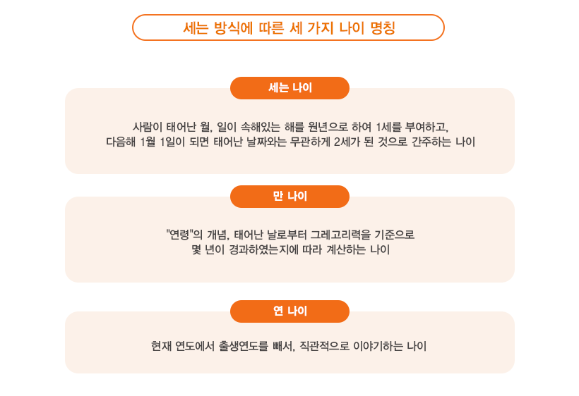 점점 커지는 숫자가 부담스러워, 처음에는 ‘세는 나이’를 이야기하다, 어느덧 ‘연 나이’를 이야기하고, 그러다 ‘만 나이’를 강조하는 저에게 등장한 ‘보험 나이’는 신박한 개념이었습니다. 먼저 일반적으로 우리가 알고 있는 나이 세는 방식을 짚어볼까요?