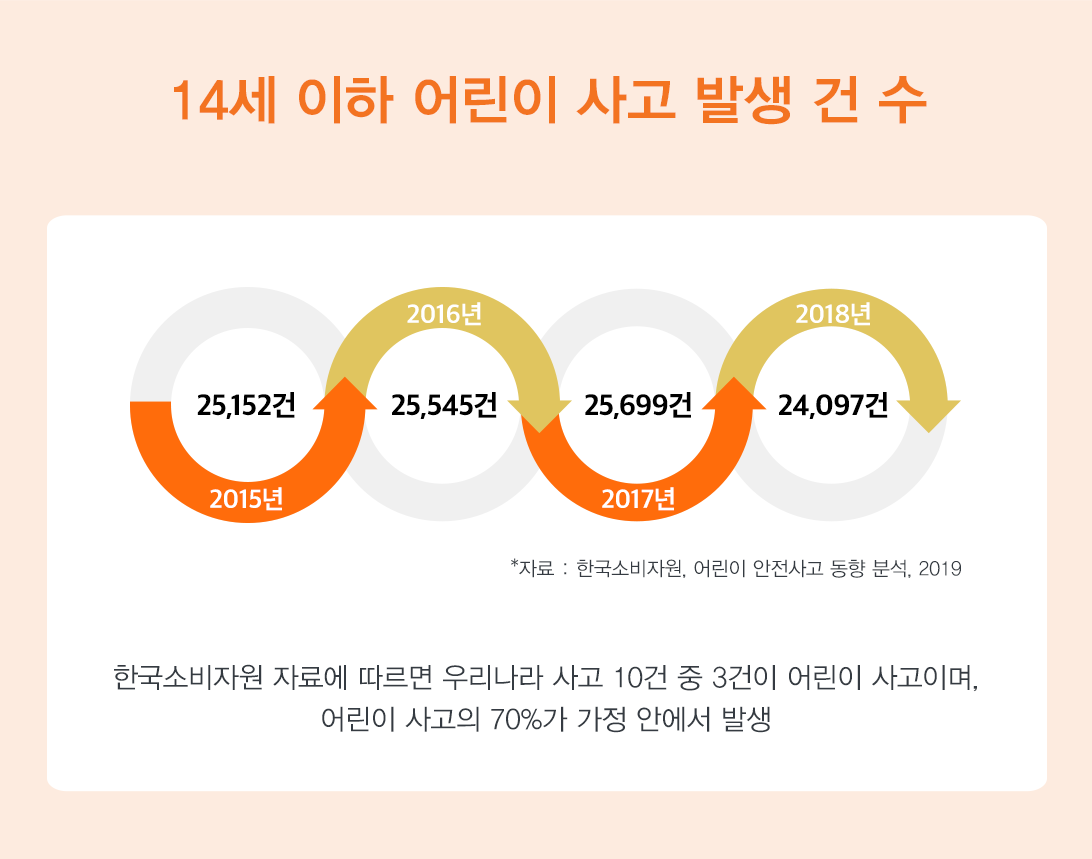 한국소비자원에 따르면 중학교 1학년을 포함한 14세 이하 어린이 사고의 70%가 가정 안에서 발생하며, 우리나라 사고의 10건 중 3건이 어린이 사고라고 합니다. 또, 통계청 자료에 의하면 2018년 기준 국내 어린이 사고 사망자 수는 163명이며, 교통사고(54명), 익사(18명), 추락(28명), 화재(8명), 중독(4명), 기타(51명) 순으로 분석됐습니다.