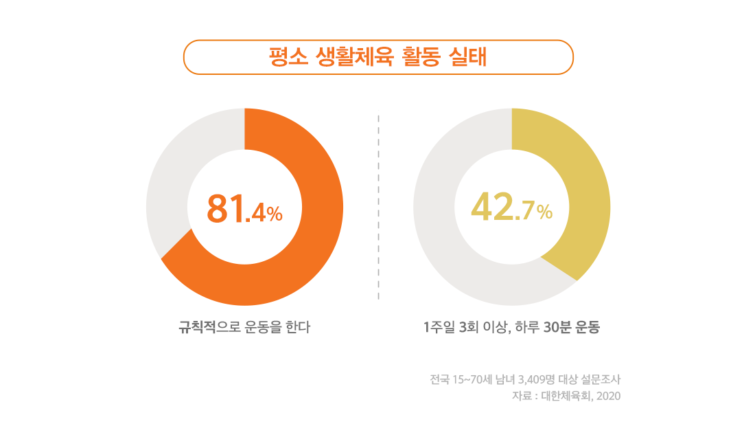 최근 코로나 19로 인해 우리 모두 건강에 대한 관심이 높은데요. 건강 관리에 빠질 수 없는 것이 바로 ‘운동’입니다. 대한체육회의 설문조사에 따르면, 전국 15~70세 남녀를 대상으로 ‘평소 생활 체육 활동을 하고 있는지’에 관하여 물었을 때 전체 응답자의 81.4%가 ‘규칙적으로 운동한다’고 답했으며 그중 주 3회 이상, 하루 30분 운동을 하는 사람은 42.7%로 나타났습니다.