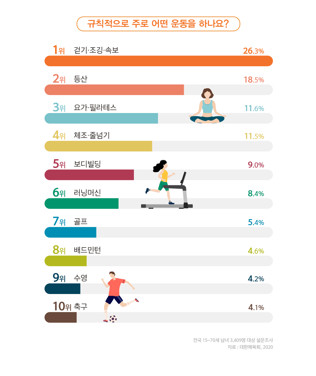 설문조사에 따르면 평소 규칙적인 운동을 하는 사람들에게 어떤 운동을 주로 하는지 묻자 별다른 장비 없이 누구나 쉽게 할 수 있는 걷기 및 조깅, 속보가 26.3%로 1위를 차지하였는데요. 그 외에도 다양한 운동 방법인 등산, 요가, 골프, 수영 등이 뒤를 이었습니다.