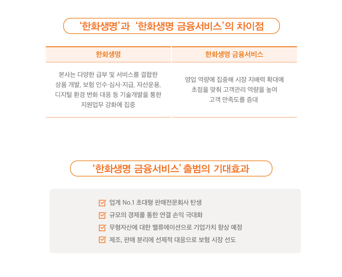 먼저, ‘한화생명’과 ‘한화생명 금융서비스’는 본사와 판매 전문회사로 분리됨으로써, 각 분야의 전문성이 더욱 강화될 수 있습니다.