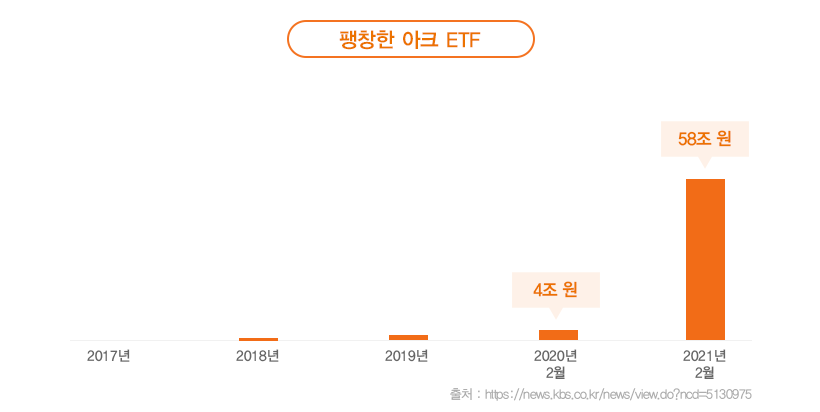 아크인베스트의 규모도 기하급수적으로 늘어납니다. 지난해 4조 원의 운용 규모였다면 1년만에 58조 원의 운용 규모로 성장하였습니다. 폭발적인 성장률을 본 국내 투자자들도 아크인베스트의 ETF에 집중투자하기 시작했습니다.