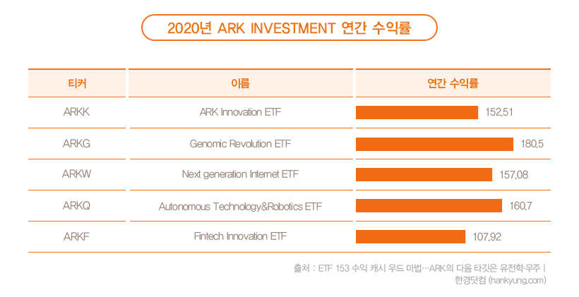 코로나가 사회를 몇 년 앞당겨 왔다는 평이 있듯이 작년 한 해 코로나 수혜기업들과 미래산업 성장주들은 폭발적인 상승을 보여줍니다. 이러한 기업들에 집중적으로 투자한 아크인베스트의 ETF들 또한 엄청난 퍼포먼스를 보여줍니다. 테슬라에 집중투자한 ARKK ETF가 2020년 연간수익률이 152.51%에 달하는 등 액티브 펀드 5개 모두 100% 넘는 수익률을 기록합니다. 이렇게 엄청난 퍼포먼스에 개인투자자들은 열광하고 국내에서는 돈나무 (캐시우드) 라는 애칭까지 붙여주었습니다.