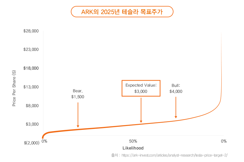 최근 3월 20일 캐시우드와 아크인베스트는 2025년 테슬라의 새로운 목표주가를 발표했습니다. 몬테카를로 시뮬레이션을 통해 목표가격을 제시하였으며 목표가격 3000달러 (액면분할 이후 기준), Bear Case 1500달러, Bull Case 4000달러를 제시하였습니다.