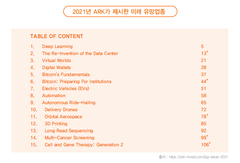캐시우드의 투자 모토는 파괴적 혁신에 투자하는 것입니다. 지금 시점을 보는 것이 아닌 미래에 사회를 바꿀 수 있는 기업들, 엄청난 성장을 이룰 수 있는 기업들에 집중투자하고 있습니다. 참고로 캐시우드는 빅테크(MAGA) 주식들은 안전자산이라고 말할 정도입니다. 아크인베스트가 운용하는 주요 액티브 ETF들을 살펴보면 ARKK(파괴적혁신), ARKF(핀테크 ETF), ARKG(바이오), ARKW(IT기업) 등으로 이름에서도 성장 가능성이 높은 것에 투자하는 것을 알 수 있습니다. 이런 아크인베스트에서 올해 초 미래유망업종 15가지와 자신들의 의견을 담은 100여 페이지 보고서를 발간했습니다. 아크인베스트 홈페이지에서 무료로 다운로드 받을 수 있으니 참고해보셔도 좋습니다. (주소 : ark-invest.com/big-ideas-2021 )