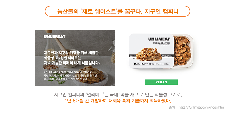지구인컴퍼니의 ‘언리미트’도 같은 맥락입니다. 국내 ‘곡물 재고’로 만든 식물성 고기 ‘언리미트’는 1년 6개월 간 개발해 대체육 특허 기술까지 획득했죠. 이 프로젝트는 미국에 출장을 갔던 민금채 대표가 ‘비욘드 미트’라는 곡물 미트를 먹은 것이 그 시작이었다고 하는데요. 비욘드 미트는 홍콩, 싱가포르, 대만에 런칭해 곧 미국 푸드마켓까지 입점할 예정이라 합니다.