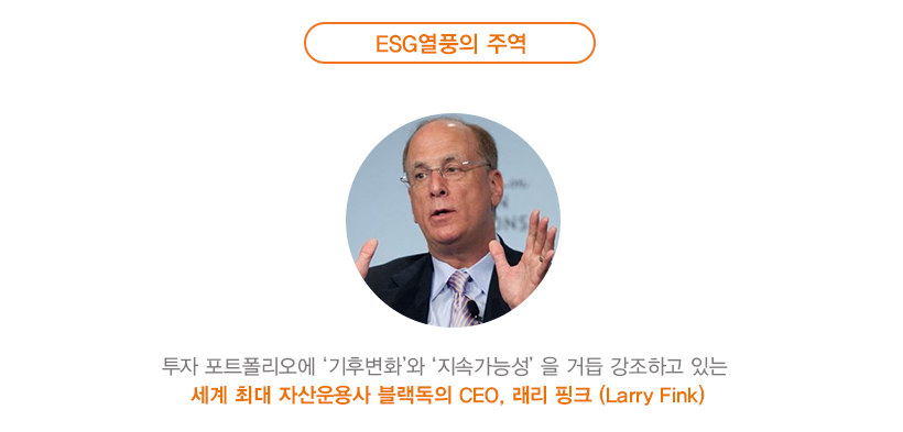 ESG 열풍을 불러일으킨 사람은 세계 최대 자산운용사 블랙독의 CEO, 래리 핑크 (Larry Fink)로 잘알려져 있습니다. 래리 핑크는 ‘모든 기업들은 이제 재무 실적만 산출할 것이 아니라, 사회에 어떻게 긍정적 기여를 할 것인지 잘 보여주어야 한다’고 주장하고 있죠. 또한 투자 포트폴리오에 ‘기후변화’와 ‘지속가능성’을 강조할 정도로 ESG의 중요성을 거듭 강조해 언급하고 있습니다.