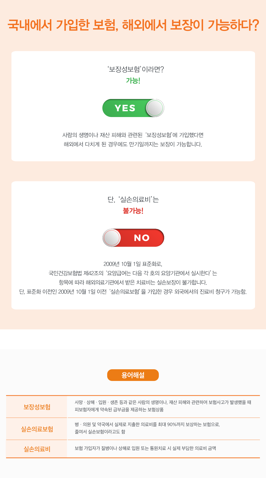 해외에서 사고 및 질병이 발생하였을 때 귀국하여 <국민건강보험법>에서 지정한 요양기관(의료기관)에 해당하는 곳에서 치료를 받는다면 치료비 보상에 문제가 없지만, 2009년 10월 1일 이후에 가입한 경우, 순자처럼 해외 의료기관에서 치료를 받는다면 실손의료비를 보장받을 수 없다는 점을 알아 두어야 합니다.