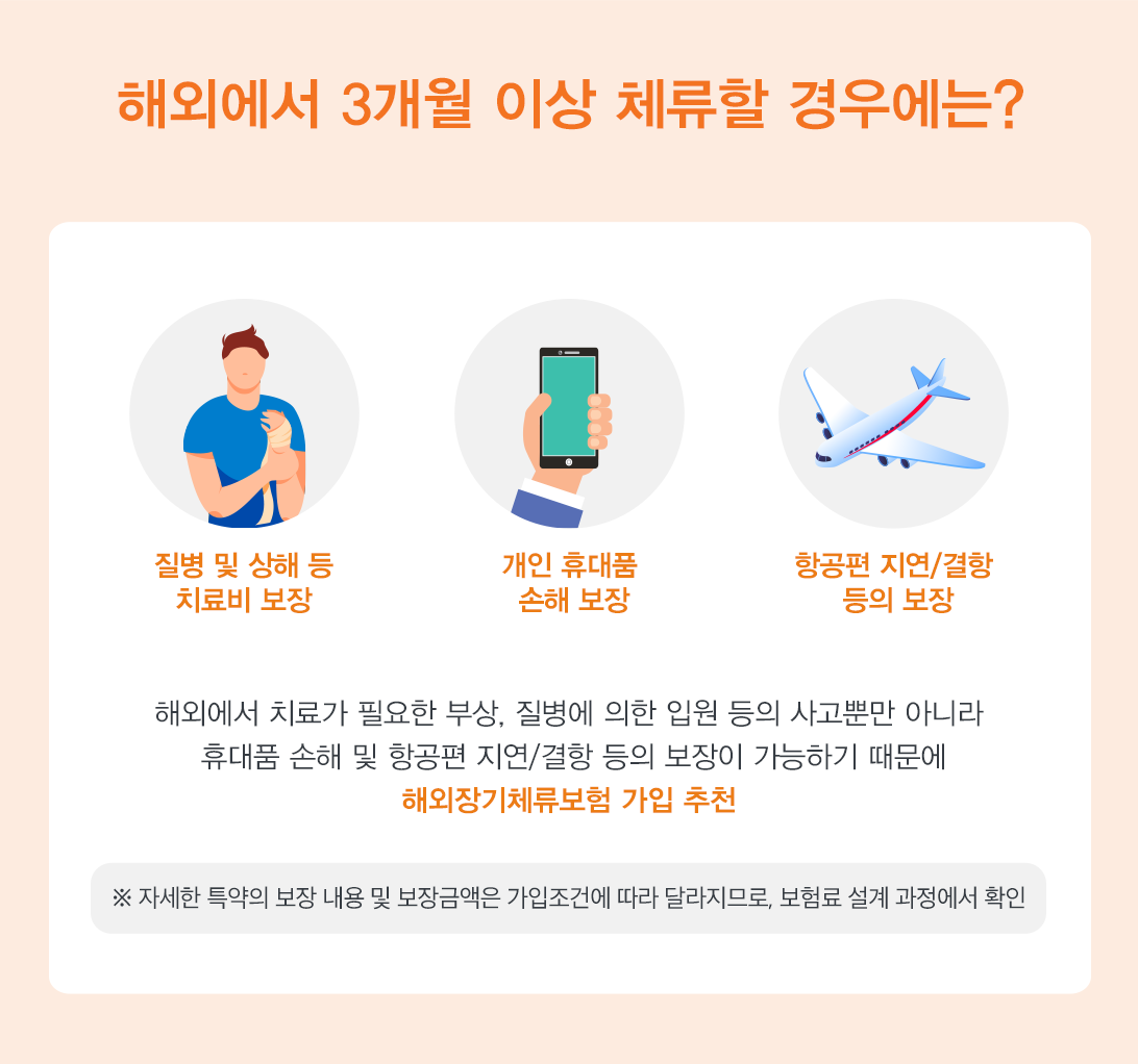 해외 체류 기간이 3개월 이상이 되면 ‘해외장기체류보험’에 가입하는 것이 좋습니다. 해외장기체류보험은 3~12개월로 가입할 수 있고, 1년 이상 체류하는 경우에는 1년 단위로 연장할 수 있어 편리한데요.