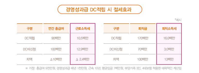# 중견기업 A社에 근무하는 K부장(50)은 올해부터 회사에서 경영성과급 전부를 퇴직연금(DC)에 적립해준다는 얘기를 들었다. 회사에서는 경영성과급을 DC로 적립하면 근로소득세가 줄어든다고 설명했다. 그동안 경영성과급을 받아서 좋긴 했지만 솔직히 세금부담이 큰 것도 사실이었다. 실제로 세금이 얼마나 줄어드는지 궁금하다.