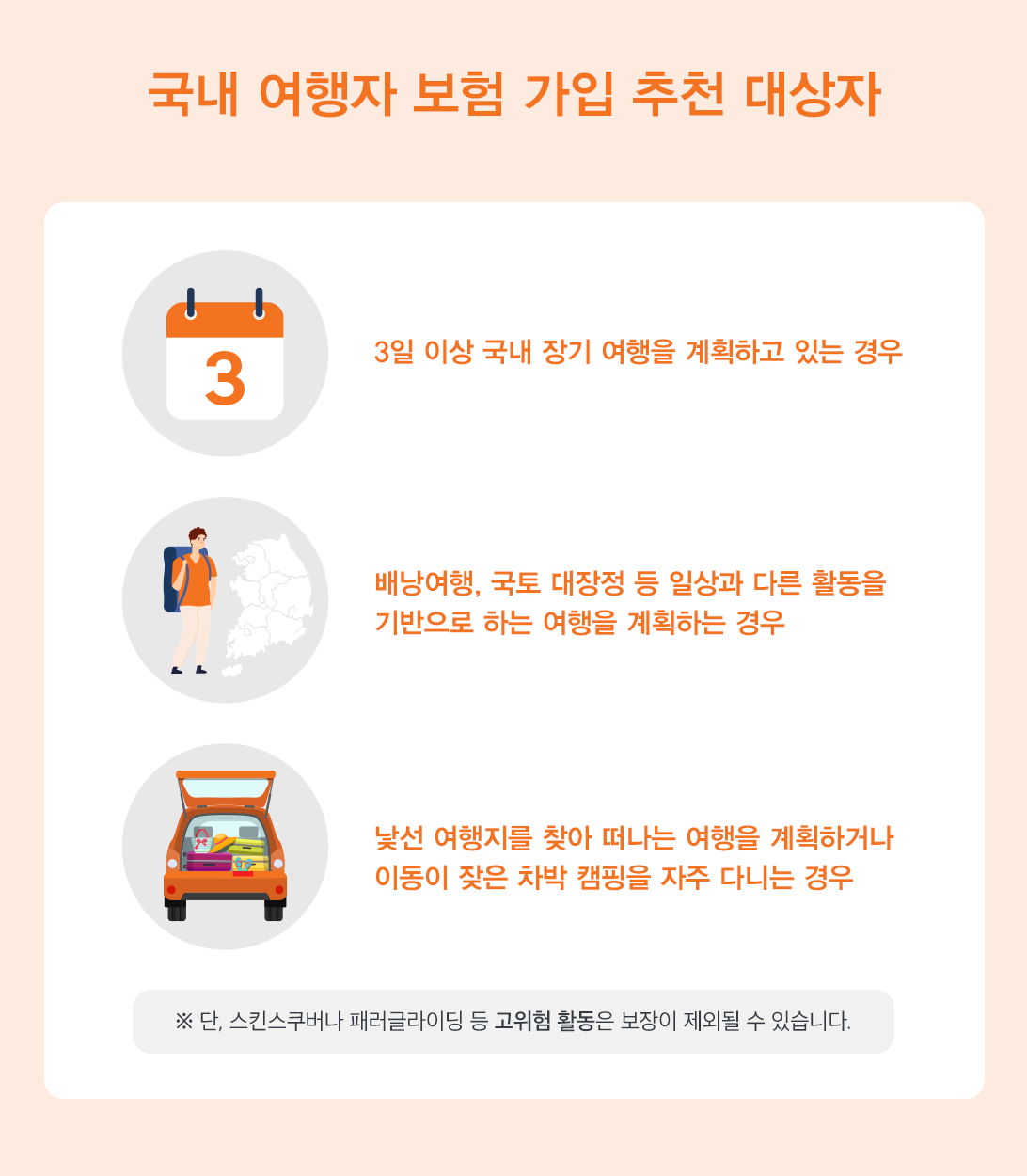 단, 국내 여행자보험에 따라서 단순 걷기의 활동은 보장하지만, ‘스킨 스쿠버’, ‘패러글라이딩’ 등과 같은 고위험 액티비티 활동은 보상이 제한될 수 있습니다. 내가 계획한 여행 일정과 활동 등을 잘 고려하여 내게 꼭 맞는 국내 여행자보험을 선택하시기 바랍니다.