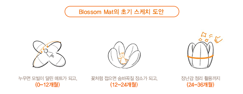 0-12개월 때는 매트 위에서 모빌 놀이를 하고, 12-24개월 때는 매트를 접어 숨바꼭질을 하고, 24-36개월엔 아이들의 장난감 정리함으로 활용할 수 있는 등. ‘Blossom Mat’는 그야말로 36개월 미만 아동의 발달과정, 그리고 각 단계에 필요한 놀이와 정서의 니즈를 과학적으로 캐치해 변신시켜 나갑니다. 마치 맞춤형 레고를 정교하게 조립하는 것처럼, 아이들을 위한 배려와 쓸모의 진화를 스스로 거듭하는 것이지요.