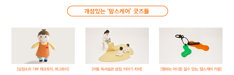 ‘맘스케어’ 사업은 ‘Blossom Mat’외에도 그간 많은 개성 있는 굿즈들을 만들어냈습니다. 보호 아동의 정서적 성장을 위해 테크토이를 만들었고 (안으면 심장소리가 녹음되어 심장소리를 자연스럽게 기부하는 프로젝트), 아동의 표현력 향상과 독서습과 형성을 위해 ‘이야기 치마’ 등을 제작한 바도 있죠. ‘이야기치마’는 맘스케어 NGO 파트너 초록우산 어린이재단과 사회적 기업 피치마켓이 함께 만들었고, 노란 은행잎 치마 안에 5명 정도의 아동이 한데 둘러 앉아 책을 볼 수 있습니다. 엄마 품에 폭 쌓여 책을 읽은 어린시절을 떠올린다면, 왜 이 굿즈가 단순 굿즈를 넘어 생활 속 인사이트와 감성을 따뜻하게 담아냈는지, 기쁘게 음미하실 수 있으리라 생각합니다.