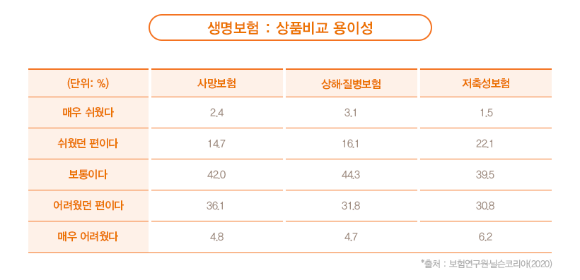 또한 최근의 설문조사에 따르면, 보험상품에 대한 비교분석이 어려워 기존의 보험사를 유지하는 소비자가 많다는 사실을 알 수 있습니다. 보험회사마다 매월 새로운 상품이 쏟아져 나오는데다, 보험회사가 한 두 군데도 아니니, 소비자 입장에서는 하나하나 비교하고 보험에 새로 가입하기란 쉬운 일이 아닌 것이죠.