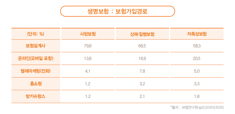 여러분께서는 보험에 어떻게 가입하시나요? 코로나19로 인한 비대면의 일상화와 채널의 다양성으로 인해 조금의 변화는 있지만, 통계를 통해 보면 여전히 보험설계사를 통한 가입이 높은 편입니다.