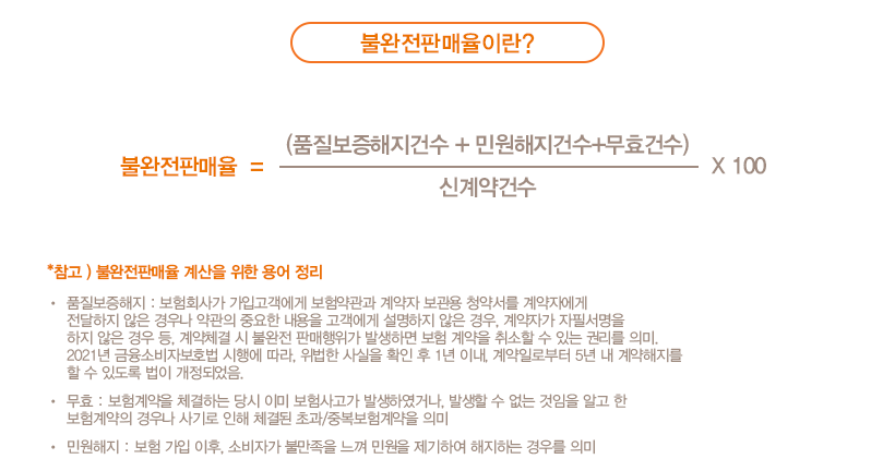 소비자를 보호하기 위해 금융감독원에서 주요하게 확인하는 지표가 있습니다. 바로 불완전판매율인데요. 불완전판매율은 보험 가입 시 계약자가 상품에 대한 중요한 설명을 듣지 못했거나, 계약 체결 과정에서 생긴 문제로 인해 보험계약이 취소되거나, 계약자가 보험회사 등을 통해 민원을 제기하여 해지된 보험계약 등의 비율을 의미합니다.