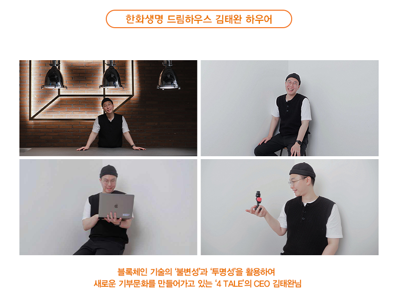이러한 기부관련 사회문제를 해결하기 위해 블록체인 기술의 ‘불변성’과 ‘투명성’을 적극 활용한 곳이 있습니다. 바로 ‘포테일’ (4 TALE)이란 회사인데요. ‘포테일’의 CEO 김태완 씨는 현재 한화생명 CSR 사업으로 운영되고 있는 ‘드림하우스’에 거주하는 하우어이기도 합니다. 드림하우스는 현재 ‘브랜드’라는 기존 컨셉에 더해 ‘지속가능’이란 사회의 트렌드를 새롭게 입었는데요. 이른바 ‘지속가능 브랜드하우스’로 테마를 설정하 (Brand, Sustainability) #Make it Brand #Social Spirit #New Normal의 세 가지 키워드를 강조하고 있죠.