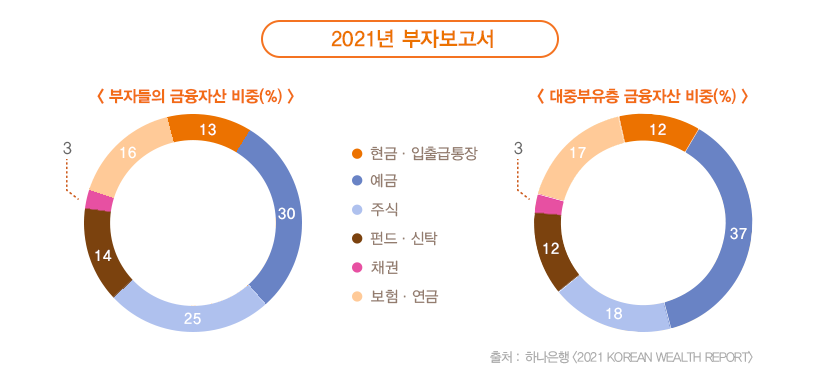 코로나 19 이후 초저금리와 주가 급등 상황에서 가계 금융자산에서 예금, 주식, 보험 등이 차지하는 비중은 얼마나 될까요. 하나은행이 발표한 2021년 부자보고서에 따르면, 금융자산 10억 원 이상을 보유한 우리나라 부자들은 평균적으로 현금과 입출금 통장에 13%, 예금에 30%, 주식 25%, 펀드 및 신탁 14%, 채권 3%, 보험 및 연금에 16%를 두고 있다고 합니다.