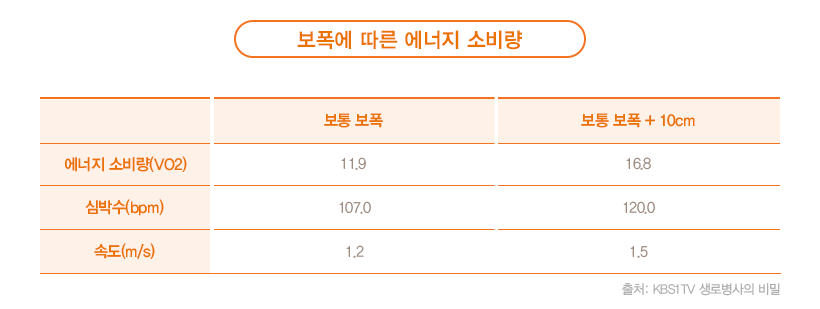 이때 +10cm가 아닌 보통 보폭의 +20cm의 경우 고강도 운동이지만 속도는 +10cm에 비해 느려지고 몸의 균형이 깨지면서 넘어질 가능성이 커지기 때문에 +10cm가 좋은 거리입니다.
