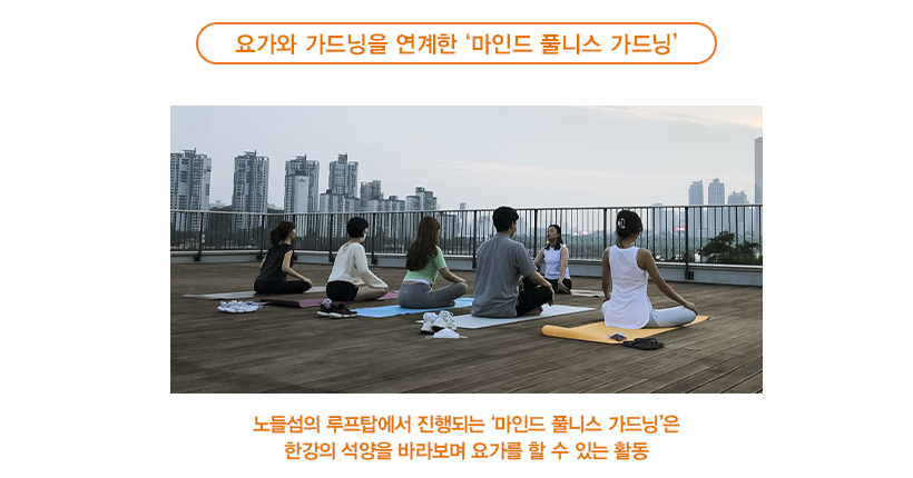 ‘마인드 풀니스 가드닝’은 식물이 자라는 모습이나, 이것을 보살피는 태도 등이 요가의 철학과 비슷하다 데서 착안했다는데요. ‘식물을 돌보는 것에서 배운 지혜를 나의 일상으로 가져오자’는 캐치프레이즈로, 식물이 자라는 원리를 배우고 직접 심어본 뒤, 노들섬의 루프탑에서 한강의 석양을 바라보며 요가를 하는 경험입니다.