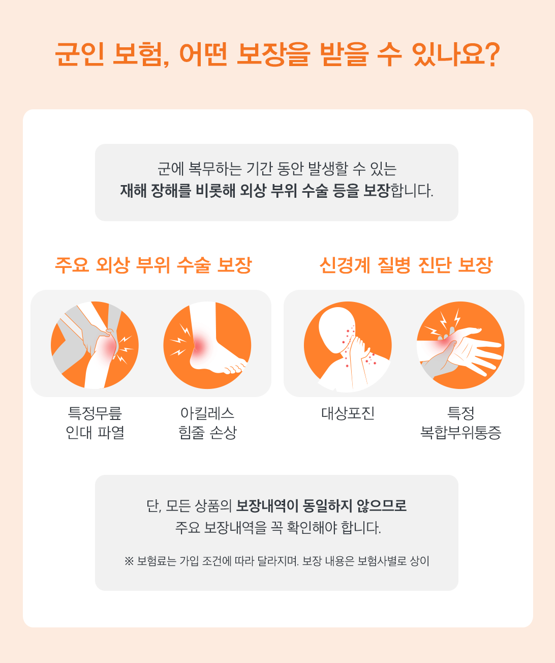 일반적으로 민간 병원에서 치료, 주요 외상 부위 수술 등을 보장합니다. 군에 복무하는 동안 발생할 수 있는 재해 장해를 비롯해 골절, 화상, 무릎인대, 아킬레스건, 디스크 수술비, 피부질환(대상포진) 등을 보장합니다. 군인 특화 보험답게 군에서 자주 발생하는 사고들을 대부분 보상하는 것인데요.