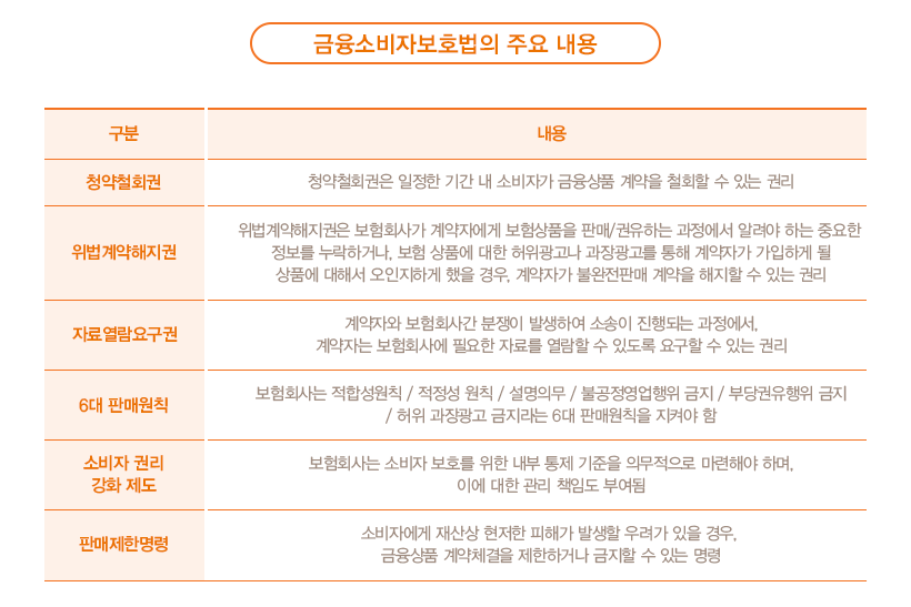 이 밖에도 금융소비자보호법에서는 허위 과장광고로부터 소비자를 보호하기 위한 광고규제, 부당권유행위 금지, 고객에게 계약 권유 시 다른 상품을 끼워팔거나 부당하게 추가 계약을 유도하는 등의 불공정영업행위를 금지하는 등의 항목도 포함되어 있습니다.