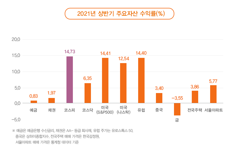 2021년 상반기 최고의 재테크 자산은 코스피로 평가됐습니다. 코스피는 6개월간 14.73% 상승했는데요. 2021년 상반기 코스피는 사상 처음으로 3300 포인트를 상향 돌파했고, 코스닥은 2000년 9월 이후 최초로 1000 포인트를 회복했습니다. 우리나라 뿐만아니라 미국, 유럽(유로스톡스 기준), 일본, 인도, 베트남, 러시아, 브라질 등이 올 상반기 중에 사상 최고치를 갈아치웠습니다.