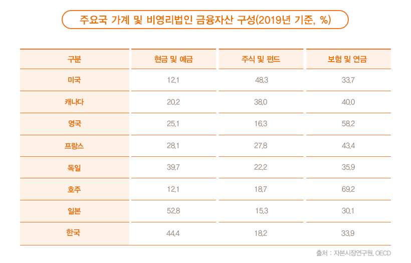 국내외 주식 투자는 전반적인 자산 배분 측면에서 접근해야 할 것입니다. 자본시장연구원 자료에 의하면, 2019년 가계 및 비영리 법인 구성 현황을 보면 한국의 현금 및 예금은 역시 44.4%에 달하는 반면, 미국과 호주는 12.1%에 그치고, 독일이 39.7%인 반면 일본은 52.8%에 이른다고 하는데요. 주식 및 펀드 비중은 한국은 18.2%이지만 미국이 48.3%에 달하고 일본은 15.3%에 불과합니다. 보험 및 연금 비중은 우리나라가 33.9%이고, 미국이 33.7% 이며, 호주는 69.2%로 가장 높습니다.