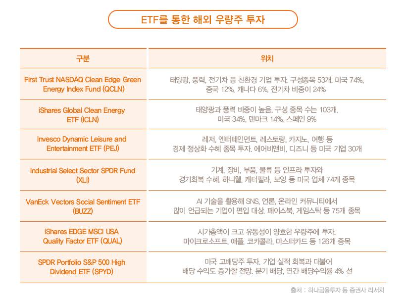 하지만 주가 움직임에는 예기치 못한 다양한 변수들이 작용하므로 그 향방을 확신할 수는 없습니다. 그렇기 때문에 단일 종목에 목돈을 일시 투입하기 보다는 다수의 우량주에 분산 투자하고, 매매 시점도 분할할 필요가 있습니다. 다수의 주식에 분산 투자하는 펀드이면서 주식처럼 거래되는 상장지수펀드(ETF)를 이용해 해외 주식에 투자하는 방안도 바람직합니다. 해외 ETF를 통해 글로벌 친환경 기업들에 투자할 수도 있고, 전세계 초우량주에도 투자할 수 있으며, 고배당 주식에도 투자할 수 있습니다.