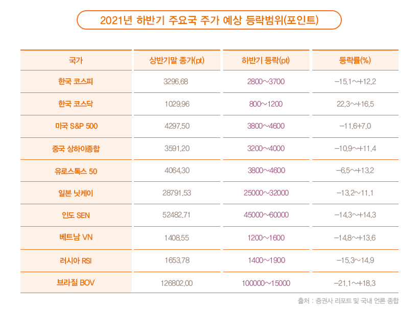 증권가에서는 올 하반기 코스피 등락 범위를 2800~3300 포인트로 내다보고 있고, 코스닥은 800~1200 정도로 관측했는데요. 우리나라를 포함한 세계 주가지수 전망치는 향후 발생하는 변수에 따라 지속적으로 수정될 것입니다. 대다수 신흥시장과 선진국 주가가 현재 고점 부근이지만, 최고치를 이미 지났다는 평가보다는 고점을 더 높여갈 것이라는 분석이 많았습니다.