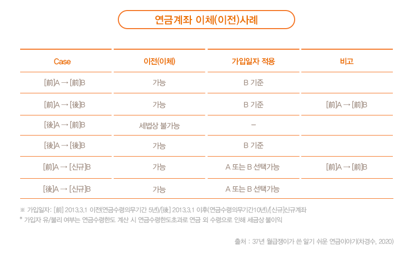 한가지 주의할 점은 2013년 3월이후에 개설한 연금계좌에서 2013년 3월 이전 개설한 연금계좌로의 이체는 연금의무수령기간의 차이로 소득세법상 불가능하기 때문에 계좌간 이체(이전)을 원하는 경우에는 연금계좌 개설일자를 반드시 살펴봐야 합니다.