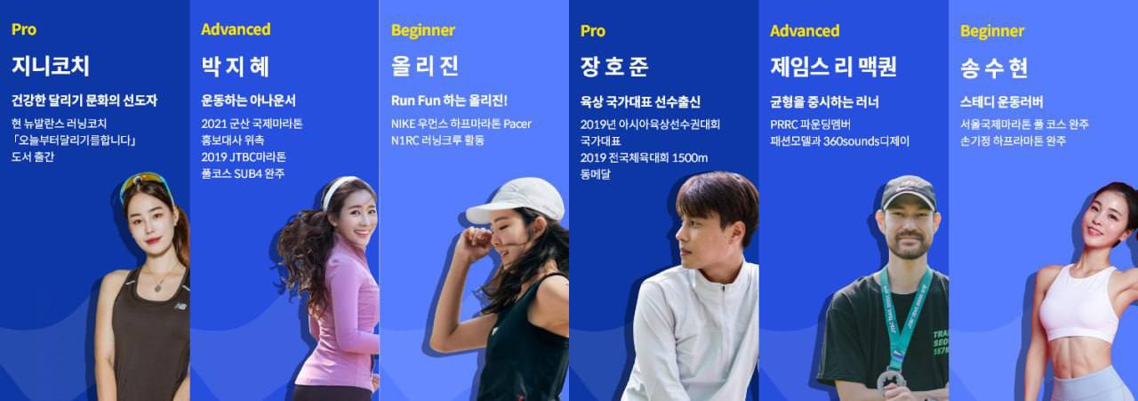 2018년 대만오픈 육상경기 선수권대회 남자 3000m장애물 1위의 육상 국가대표 출신 장호준 선수를 비롯해서 러닝 인플루언서인 지니코치(이진이)등 러닝 전문가 및 인플루언서 6인이 라이프어드바이저로 참여합니다.
