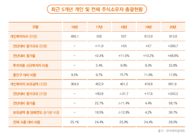 한국예탁결제원이 발표한 2020년 12월 결산 상장법인 개인 소유자 현황에 따르면, 2020년 말 개인 투자자 수는 914만 명으로 2019년 말의 614만 명 대비 300만 명(49%) 증가했습니다. 개인 투자자 중 32.8%는 2020년 중에 주식 투자를 시작한 셈으로, 2020년 말 총 인구 5,183만 명의 17.7%가 주식 투자자인 것이죠. 개인 투자자의 주식 보유 금액은 2019년 말 419조 원에서 2020년 말 662조 원으로 243조 원(58%) 많아졌습니다.