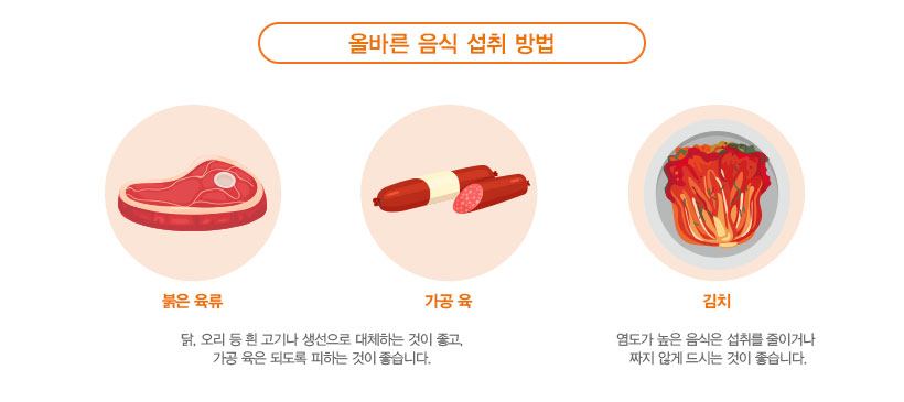 짠 음식, 육류 중심의 고열량, 고지방식은 고혈압 등의 생활 습관 병을 비롯해 발암 가능성을 높일 뿐만 아니라 전반적인 신체건강에도 좋지 않습니다. 고열량, 고지방식은 비만을 유발하면서 심혈관질환의 위험을 높입니다. 비만은 대장암, 유방암, 췌장암, 자궁내막암 등 다양한 질병을 유발할 수 있는 위험인자입니다. 또 붉은 육류나 가공 육은 발암가능성이 있습니다.