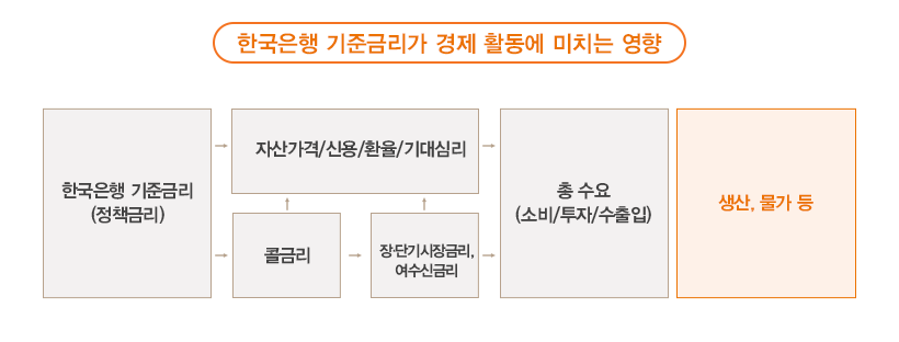 한국은행이 기준금리를 변경하면 다양한 경로를 통해 경제 전반에 영향을 미칩니다. 특히 기준금리 변경은 단기시장 금리, 장기시장 금리, 은행 예금 및 대출 금리 등 금융시장의 금리 전반에 영향을 주고요. 그리고 각종 금리의 움직임은 소비와 투자에도 영향을 주게 됩니다. 예를 들어 금리가 상승하면 차입이 억제되고 저축은 증가하는 한편, 예금이자 소득은 줄어들지만 대출이자 지급은 늘어나 가계의 소비가 감소할 수 있는데요. 기업의 경우에도 다른 여건에는 변화가 없는데 금리가 오르면 금융비용이 증가해 투자가 축소될 수 있습니다.