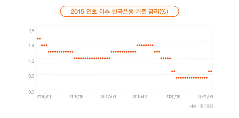 한국은행은 지난 8월 기준금리를 올리면서 국내 경제가 양호한 회복세를 이어갔고, 소비자물가 상승률은 2% 대 중반의 높은 수준이라고 평가했습니다. 또한 앞으로 통화정책의 완화 정도를 점진적으로 조정해 나갈 것이라고 언급함으로써 추가적인 금리인상 가능성을 시사했는데요. 2021년 금융통화위원회 회의는 오는 10.12(화)와 11.25(목) 두 차례 남아 있는데, 일각에서는 11월에 기준금리가 또 한 번 인상될 가능성을 거론하고 있습니다.