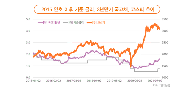 한국은행이 2년 10개월 만에 기준금리를 인상하고 미국도 유동성 공급 규모를 줄일 방침이라고 선언한 것은 국내외 경제가 개선되고 있음을 시사하는 것이기도 합니다. 금리 상승이 대출 부담을 가중시키고 투자를 제한하는 요인임에도 불구하고 금리 상승기에 주가가 오르는 것은 바로 경기가 좋아지기 때문인데요. 기준금리와 국고채 금리 그리고 코스피 추이를 비교해 보면, 기준금리와 국고채 금리가 상승할 때 코스피도 강세인 경우가 많았다는 사실을 볼 수 있습니다.