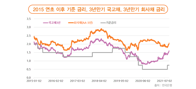 한국은행이 기준금리를 조정하면 대표적인 시장 금리인 국고채와 회사채 수익률도 움직입니다. 아래 그래프는 2015년 1월 초 이후 기준금리와 3년만기 국고채 금리, 그리고 3년만기 AA- 등급 회사채 금리 추이입니다. 기준금리가 인상되면 국고채와 회사채 금리도 오르고, 기준금리가 인하되면 국고채와 회사채 금리도 대체로 하락한다는 사실을 확인할 수 있습니다.
