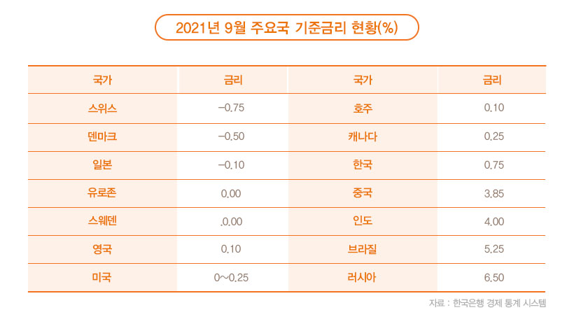 2021년 9월 현재 우리나라 기준금리는 0.75% 이지만, 미국은 0~0.25%, 유럽중앙은행은 0%, 일본은 마이너스 0.1%를 기록하고 있습니다. 일본뿐만 아니라 스위스, 덴마크 등 일부 유럽 국가들의 금리는 마이너스입니다. 반면 인도는 4.0%, 브라질 5.25%, 러시아 6.5% 등 신흥국들은 여전히 상대적으로 높은 금리 수준입니다.