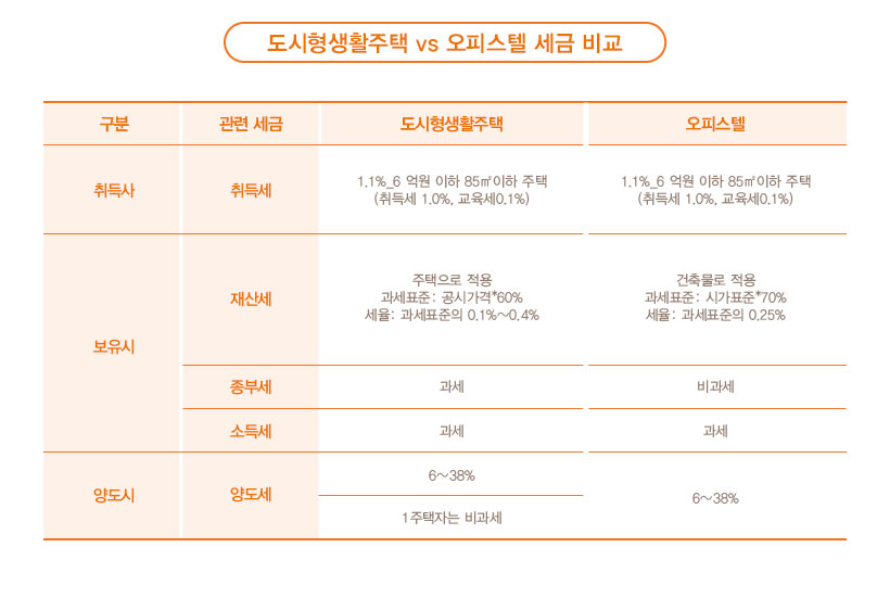도시형 생활주택은 원룸형이 많아 오피스텔과 유관상으로는 비슷한데, 사실 세제상 차이가 있어 본인의 상황을 잘 고려해 접근할 필요가 있습니다. 취득세는 오피스텔이 4.6%를 납부하는데 비해, 도시형 생활주택은 주택으로 분류되고 소형으로 지어지기에 보통 6억원 이하 85㎡ 이하 주택에 해당한다면 1.1%정도의 세율에 불과합니다.