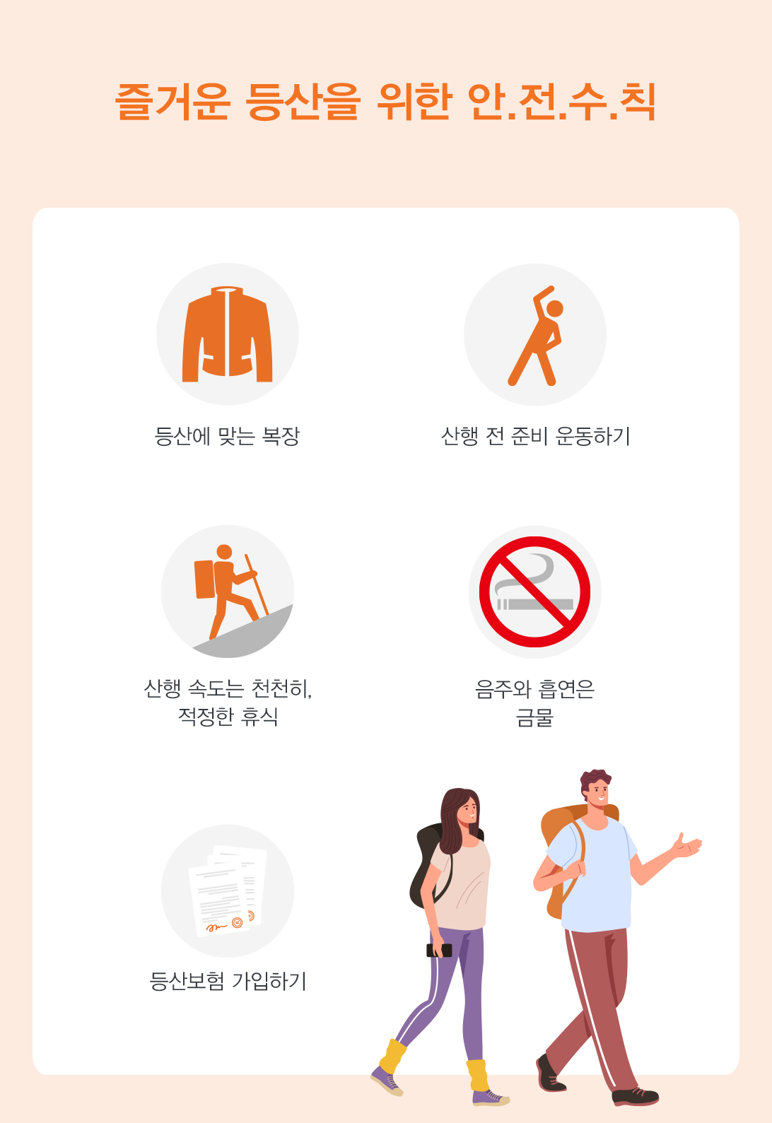 등산 초보자뿐만 아니라 경험자들도 익숙하지 않은 산을 오르거나 날씨 등의 변수로 인한 사고는 언제든 발생할 수 있습니다. 넘어지거나 미끄러져 다칠 경우, 나뭇가지에 긁혀 상처가 나는 경우, 발을 헛디뎌 굴러 넘어지는 경우 등 다양한 사고에 대비해 간단한 등산 보험 가입을 해두는 것이 좋겠죠?