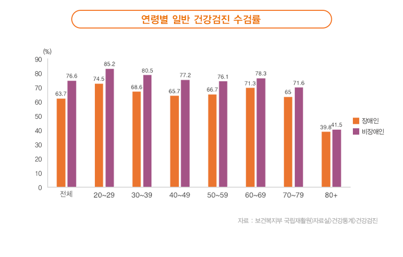 마지막 하나는 바로 건강검진입니다. 지역세대주, 직장가입자, 만 20세이상 세대원 및 피부양자, 만 19세~64세 의료급여수급자가 그 대상입니다. 출생년도 뒷자리의 홀/짝수에 따라 2년 주기로 건강검진을 받아야 하는데요. 올해는 2021년 홀수 해이기 때문에 홀수 해에 태어난 이들이 건강검진을 받아야 하는 해입니다. 통계자료에 따르면, 우리나라 일반 건강검진 수검률은 장애인 63.7%, 비장애인 76.6%에 달한다고 합니다.