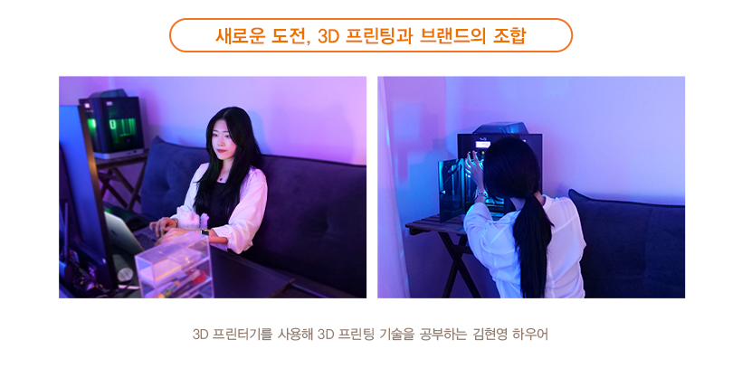 그리고 최근에 하우스에 와서 좋은 소식은 바로 ‘3D 프린터 운용기능사’를 취득한 일입니다. 제품뿐만 아니라 패션, 식품, 건축, 의료 등 다양한 분야에서도 3D 프린팅 기술이 활용되는 추세거든요. 혹시 3D 프린터로 출력한 인공육 스테이크에 대해 알고 계시나요? 식물성 단백질과 지방을 층층이 쌓아 만든 고기인데, 실제 소고기보다 가격도 저렴하고 소를 키우면서 배출되는 이산화탄소를 줄일 수 있어 자연 친화적이라고 합니다. 그만큼 3D 프린팅 기술을 이용하면 제조 과정에서 발생하는 시간, 노력, 에너지의 낭비를 최소화하고, 원하는 결과물을 얻을 수 있죠. 3D 프린팅과 브랜드의 조합, 이것이 향후 제 계획의 단초이기도 합니다. (웃음)